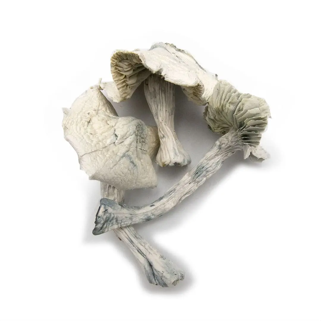 • Pale, ghostly white caps with a slight blue tint, indicative of high psilocybin content.
