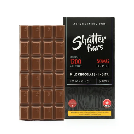 The Euphoria Extractions Shatter bars are the perfect solution for your edible needs. With 24 squares, these bars are easy to manage and contain a potent 250mg, 500mg or 1200mg of Lab Tested Full Spectrum Extract sourced from the finest cannabis Sativa available. Euphoria Shatter bars are guaranteed to provide total satisfaction. New high dosage Shatter bar products are intended for experienced users.